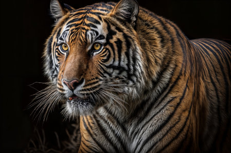 A captivating portrait of a tiger's face, captured in dramatic lighting. The striking gaze, detailed fur, and vibrant stripes emphasize the beauty of wildlife.