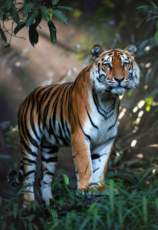 A majestic tiger in its natural jungle habitat, emphasizing wildlife, nature, and conservation.