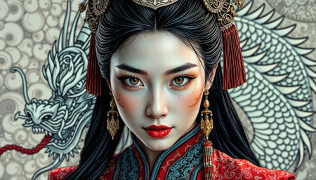 Portrait of a graceful young woman adorned in beautiful asian ceremonial dress with intricate makeup and hairstyle