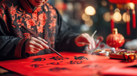 A close-up shot of a person's hands skillfully writing Chinese calligraphy with a brush and ink on red paper The image showcases the intricate details of the art form and the traditional attire of the artist This is perfect for projects about Asian culture traditions and celebrations