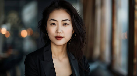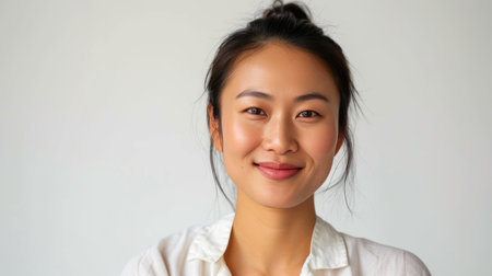 Pretty Asian individual with a warm, inviting smile, background for copy space or marketing purposes