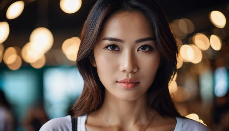 In Thailand, a woman stands confidently, her gaze steady and engaging. The warm, soft bokeh from background lights creates a cozy atmosphere, enhancing her striking features.