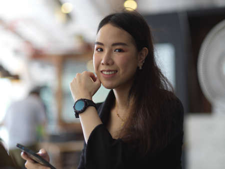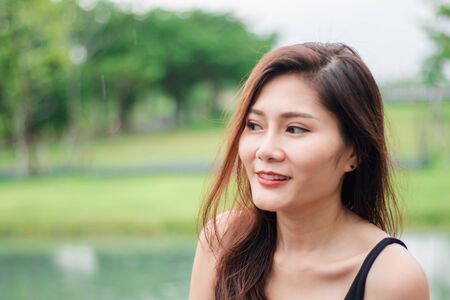 Asian beautiful woman looking to camera with smile and happiness on her leisure day