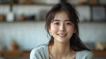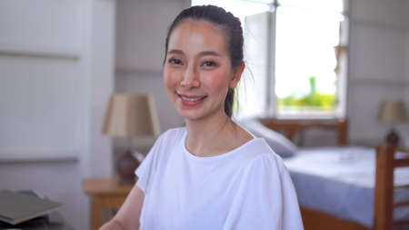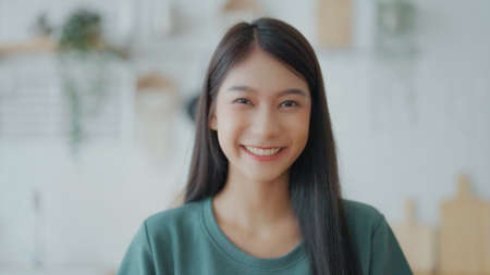 Portrait Happy Attractive Young Asian Woman Relaxation Smiling at home. beautiful female Healthy cheerful, Laughing, positive, confident, friendly looking at the camera.
