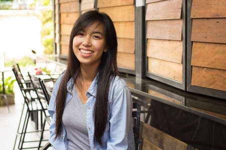 Portrait shot of happy friendly and confident Asian woman wearing casual clothes happy face smiling looking at the camera. positive person