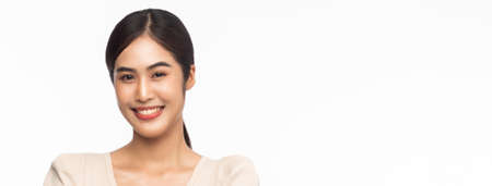 Asian woman with clear, glowing skin, smiling on a white background. Cosmetology and skincare concept. Plenty of space for text on the left.