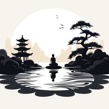 Monk Meditating in Japanese Garden with Lake., generative AI