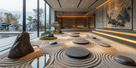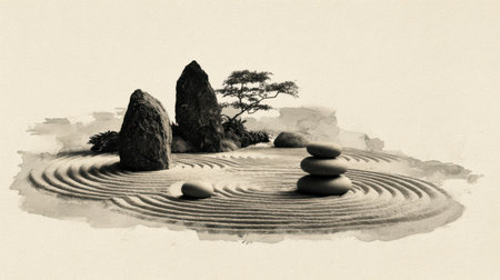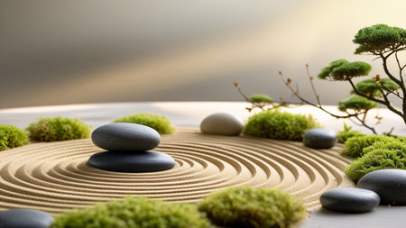 Serene Japanese zen garden featuring raked sand and rocks in minimalist design