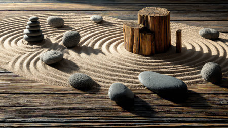 Discover a serene zen garden featuring intricate sand patterns, smooth stones, and natural wood elements, perfect for relaxation and meditation.