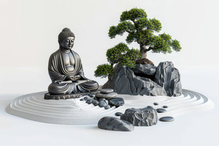 This serene zen garden scene features a miniature tree atop rocks surrounded by softly raked sand, inviting mindfulness, peace, and relaxation in any environment.