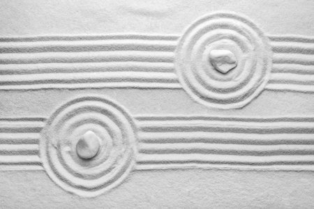 White stones on sand with pattern, top view. Zen, meditation, harmony