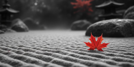 Zen rock garden with maple leaf Mindfulness and Japanese culture concept Traditional Zen rock garden with single red maple leaf