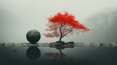 Lone red tree and stone ball on misty forest background, tranquil minimalist landscape. Peaceful foggy nature scene. Concept of art, beauty, minimalism, travel, mist, environment and calm. Generative AI