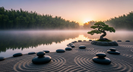 A serene scene showcases a bonsai tree and stacked stones resting on raked sand inviting peace.
