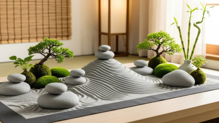 Serene Zen garden with carefully arranged white sand, smooth pebbles, and green plants, promoting relaxation and mindfulness in a tranquil setting.