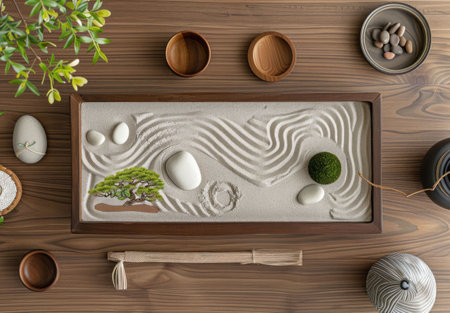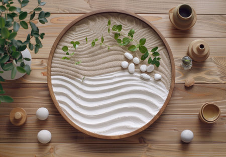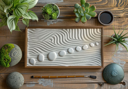 Zen garden arrangement with pebbles and plants on a wooden surface, creating a calming and peaceful atmosphere for relaxation and mindfulness practices.