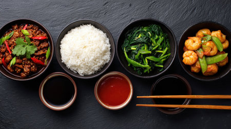 A visually appealing arrangement of Asian cuisine featuring shrimp, seasoned beef, fragrant rice, and fresh vegetables presented on a dark slate surface.