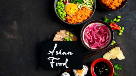 Asian food on dark background, panorama.