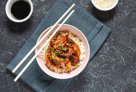 Homemade sesame Chicken served with Jasmine white rice. top view