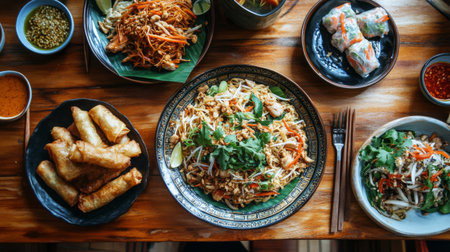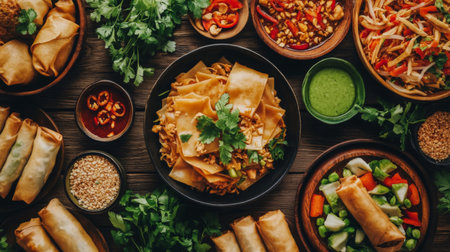 Experience a vibrant spread of Asian cuisine featuring noodles, spring rolls, and fresh vegetables beautifully arranged on a wooden table, perfect for sharing.