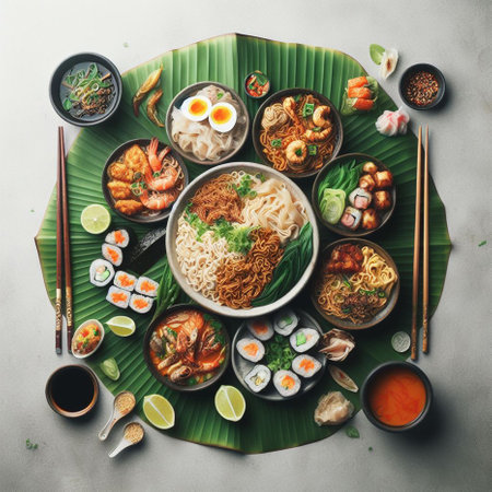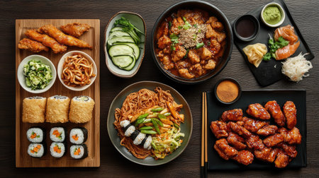 AI Generated. Top view composition of various Asian food