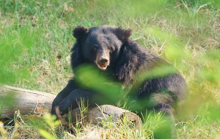 Asian black bear or Asiatic black bear or Selenarctos thibetanus is resting during the day near the timber.