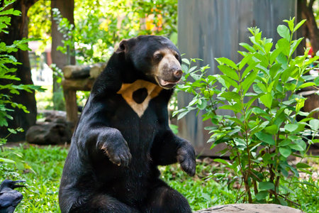 Helarctos malayanus waiting for its food in the zoo / Malayan sun bear standing and relax in the summer