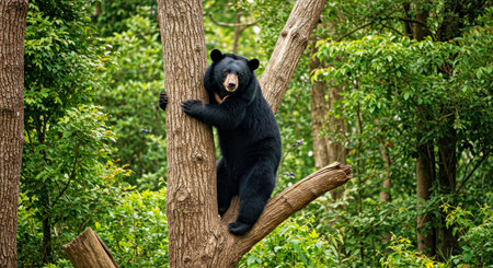 Black bear climbing a tree in the forest. Animal in nature.