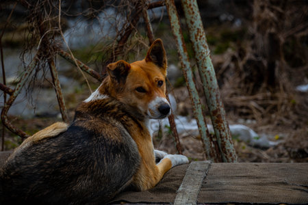 a dog lies in a mountain of garbage after flooding devastation a pet after a flood a natural disaster