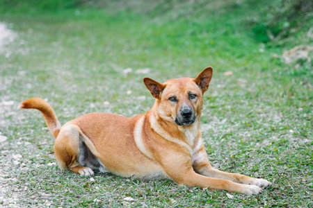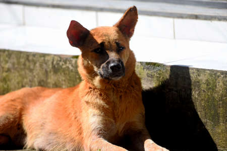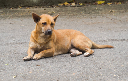 Dog - sad, lying on the gray asphalt road during the day, brown and orange coloring, mongrel pets