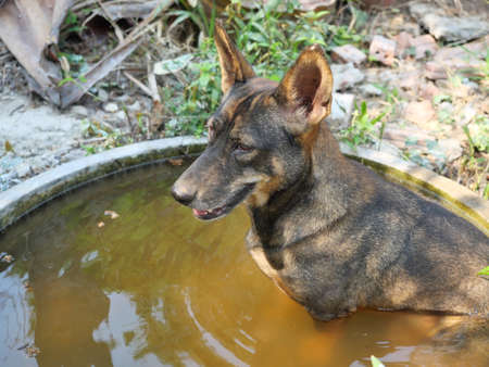 The dark brown dog sitting in the water in the tub, Pet behavior and rest in the summer and during hot weather