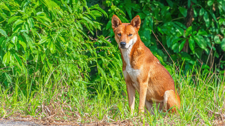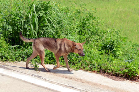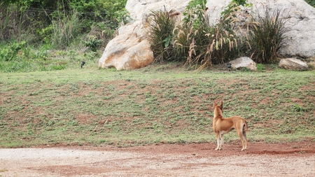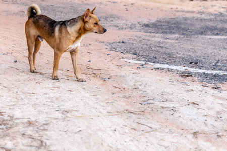 Thai dog standing on the road and looking at the camera.
