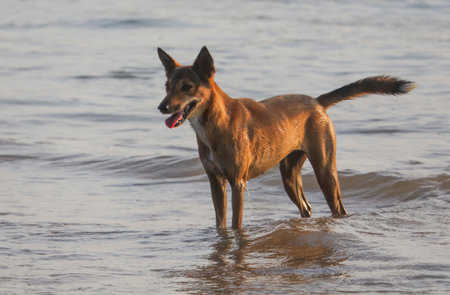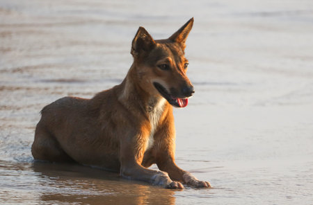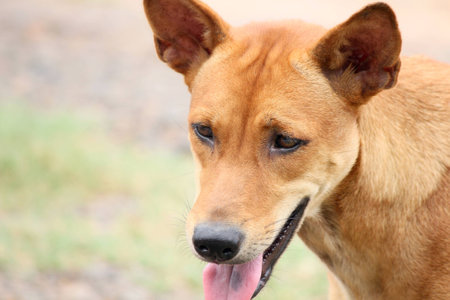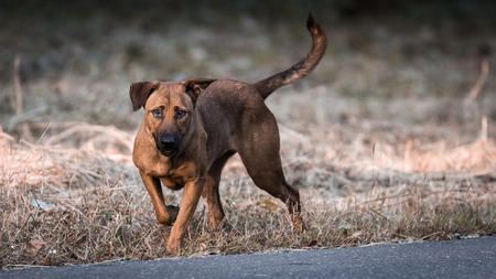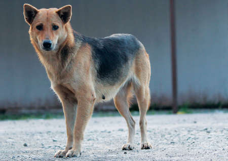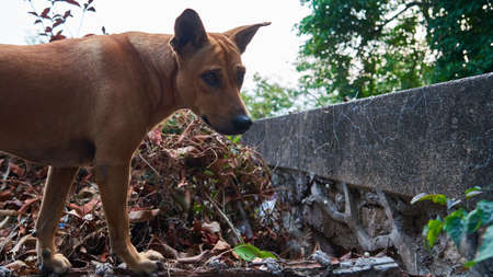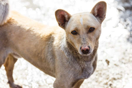 Stock photo of hungry and innocent brown color street dog roaming on the street and looking at the camera at Chittapur , Karnataka India.