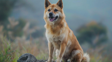 Japanese Shiba Inu dog sitting on a rock in the grass