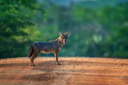 A coyote stands confidently on a dirt road surrounded by vibrant greenery. The time is during the golden hour, casting warm hues across the landscape. The animal appears alert, with its tongue out, enjoying the cool evening breeze. This peaceful moment showcases the beauty of nature and wildlife.
