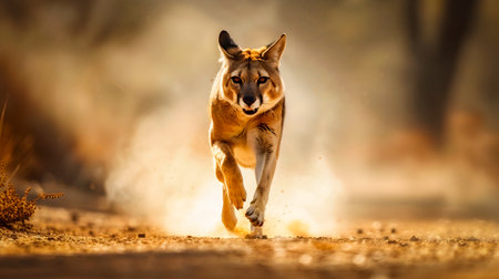 Thylacinus Tasmanian Tiger Sprinting Down Dirt Road with Dust Clouds Billowing in its Wake