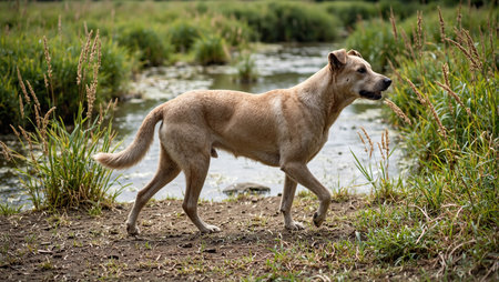 Loyal dog strolling by serene stream