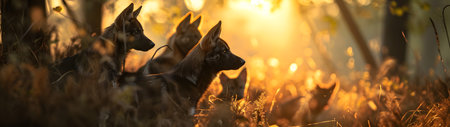 Wild dogs standing in the forest with setting sun shining. Group of wild animals in nature. Horizontal, banner.