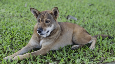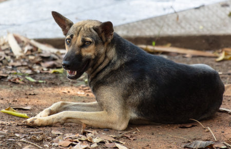 Wild dog in Bali relaxing on the ground - looking to the side