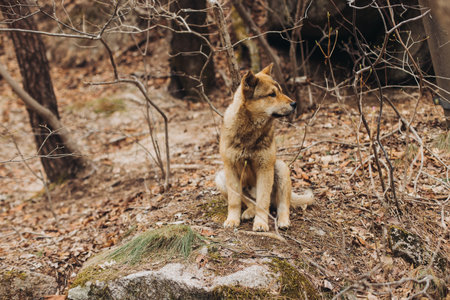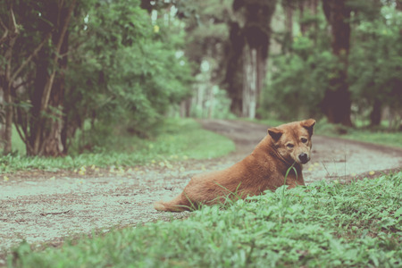 dog sit on the way forest