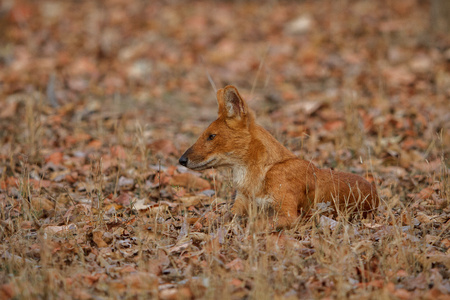 Photo of Dhole WIld Dog looking to scavenege in India with selective focus on the animal
