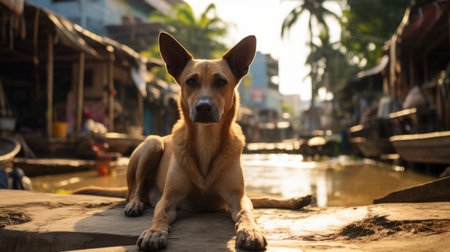 a dog sitting on a street, overlooking water and people, bathed in golden light. the image captures the essence of indian pop culture with its strong facial expression. the aesthetics of the farm security administration and the art of the ivory coast are evident in this uhd image, adding depth to the city portrait. ai generated