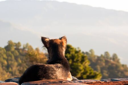Dog looking for mountain view and summer morning with light and fog between hills