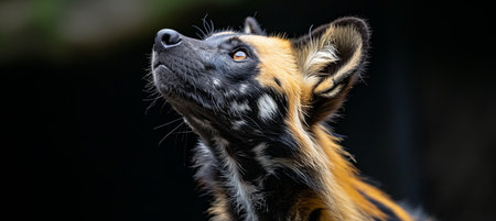 Intense close up portrait of fierce howling wild dog with empty space for text placement