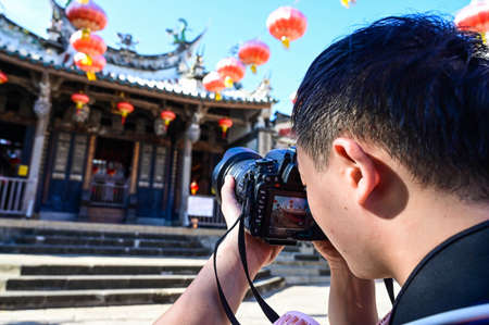 Penghu County, Taiwan-AUG 09, 2020: Man photographing Mazu Tienho temple.