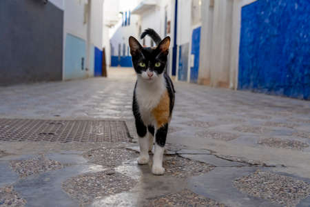 A small stray cat walks around in a city in Morocco