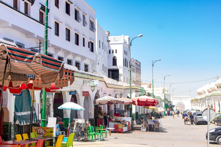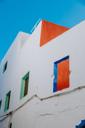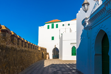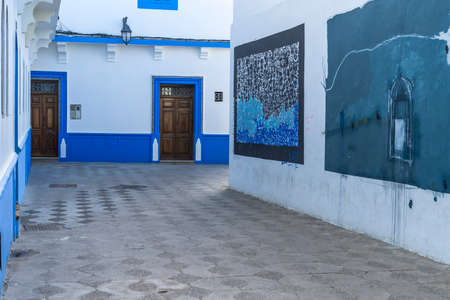 Beautiful view of street with typical arabic architecture in Asilah. Location: Asilah, North Morocco, Africa. Artistic picture. Beauty world