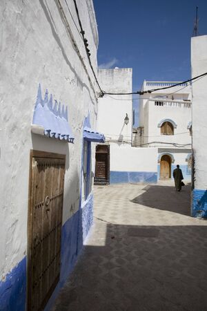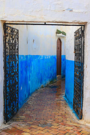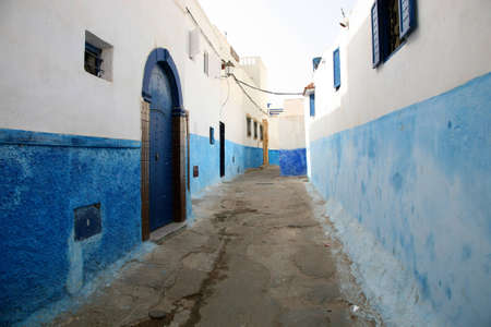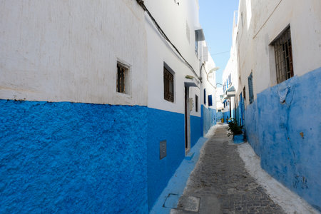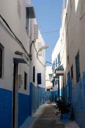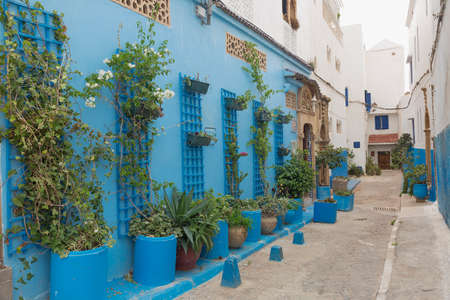 Small street in blue and white in the kasbah - old part of city Rabat, Morocco.