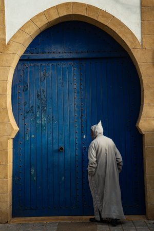 Morocco. Essaouira. A man dressed in a djellaba in front of a blue door of the mosque