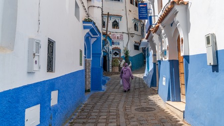 Chefchaouen , Morocco - April 2018: Unidentified woman walking in blue medina of Chefchaouen city in Morocco, North Africa